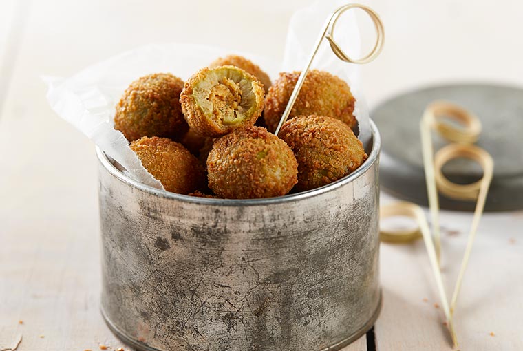 Realizar pequeñas bolitas con la pasta obtenida y enroscar las aceitunas alrededor presionando suavemente con las manos.