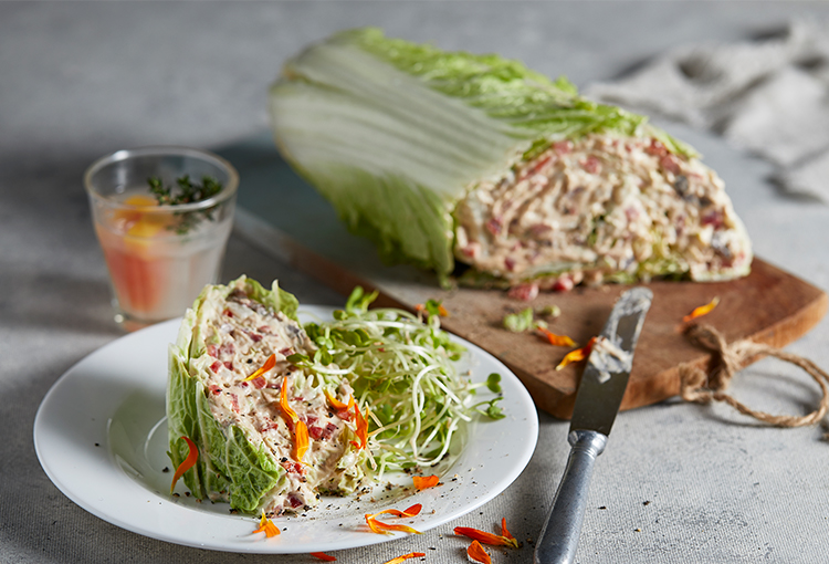 Cortar el akusai al medio a lo largo cuidando que las hojas no se desprendan del tronco. Lavarlo y escurrir cuidadosamente. Apoyarlo en un film, retirar el tronco central sin desprender del todo las hojas e ir abriéndolas desde las más grandes a modo de abanico, untarlas con la mezcla y repetir con las siguientes capas.