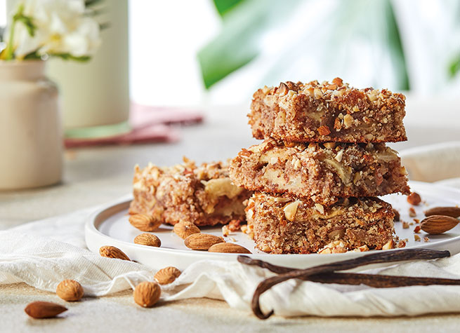 Disponer la mezcla en un molde de 20x20 cm. forrado con papel manteca lubricado con Rocío Vegetal Natura, llevar a horno precalentado durante unos 20-25 minutos hasta lograr la completa cocción. Retirar, cortar en cuadrados y servirlos espolvoreados con azúcar impalpable a gusto.