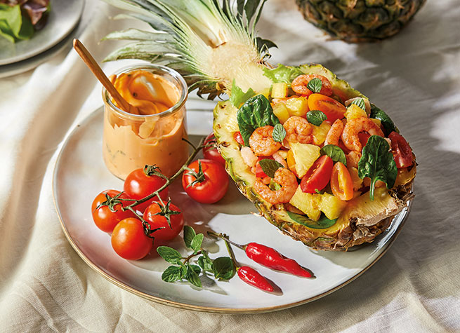 Retirar los cuencos de ananá de la heladera, rellenar con la ensalada y verter por encima el aderezo de Salsa Golf Natura.