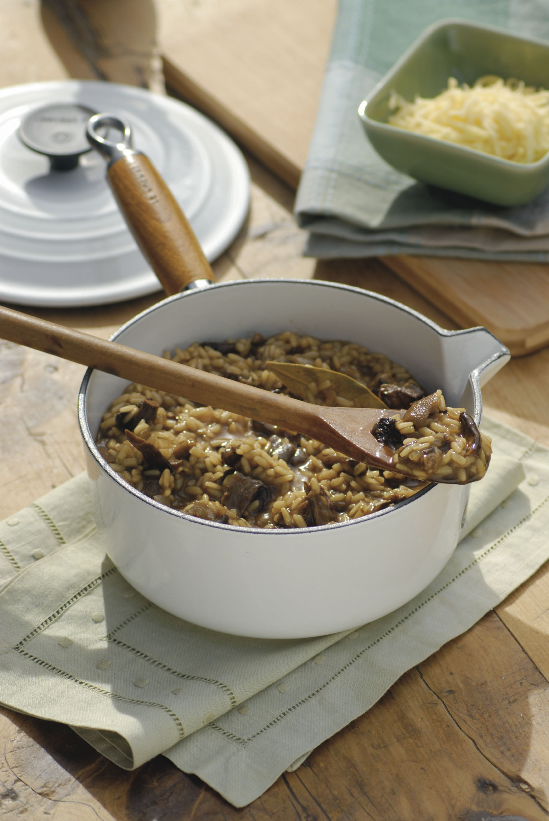 Luego retirarlos del agua, colar la misma y reservarla. Disponer una olla a fuego medio y verter allí el Aceite Puro de Girasol Natura, cuando tome temperatura añadir la cebolla, dejarla dorar y agregar luego los hongos picados. Rehogar unos segundos, incorporar el laurel, sal, pimienta, agua de remojo de los hongos y el caldo.