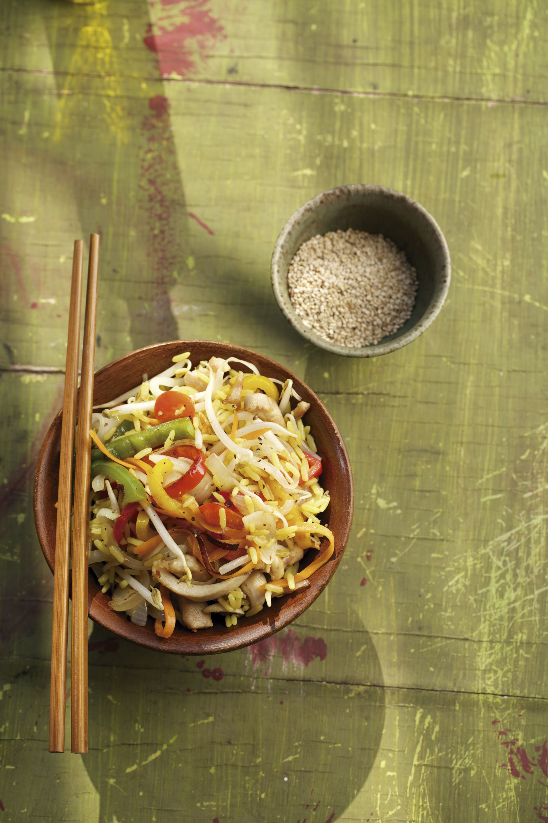 Calentar el Aceite de Girasol Natura en un wok o una sartén precalentada. Incorporar el pollo cortado en tiras y saltearlo a fuego vivo hasta que tome color dorado. Incorporar los pimientos durante 3-4 minutos. Añadir el arroz cocido poco a poco, removiendo cada vez, para mezclarlo bien y para que los granos queden sueltos.