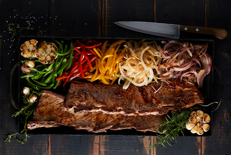 Retirar la carne en el punto deseado y servir con la guarnición de vegetales, descartando previamente los ajos.
