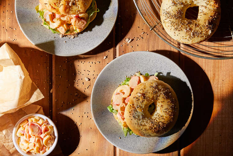 Una vez fríos los bagels, abrirlos y rellenarlos con las hojas de lechuga cortada en tiritas y la mezcla de Salsa Golf reservada.