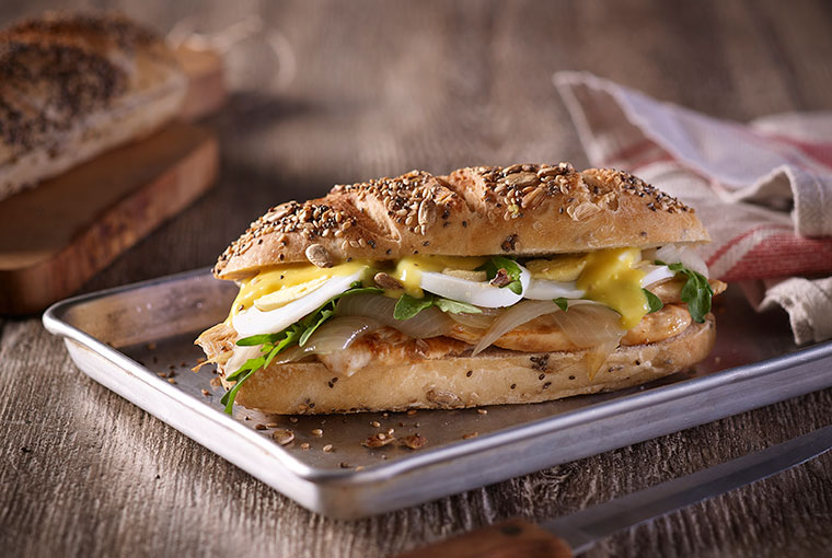 Baguette semillada de pollo, cebollitas asadas, huevo duro y un toque de mostaza