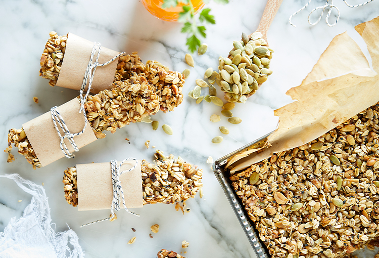 Forrar una fuente rectangular pequeña con papel manteca y lubricarlo con Rocío Vegetal Natura. Volcar la mezcla y compactar bien con ayuda de una cuchara o de los dedos. Llevar a horno precalentado a 180ºC durante unos 15-20 minutos aproximadamente hasta dorar. Retirar, dejar entibiar y cortar las barritas. Consumir o reservar en recipiente cerrado.