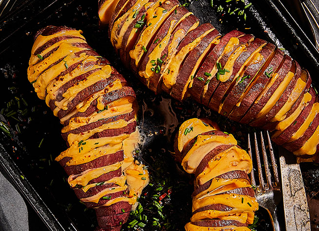 Pincelar con la mezcla de la Mostaza Natura y el Aceite Blend Natura, salpimentar a gusto. Disponer cada batata sobre un trozo de papel aluminio lubricado con Rocío Vegetal Natura, cerrar armando un paquete. Colocar los paquetes sobre una placa y llevar a horno precalentado durante unos 35-40 minutos. Retirar, abrir cuidadosamente el paquete de aluminio, distribuir las fetas de cheddar en cada corte del acordeón y llevar nuevamente al horno hasta fundir el queso. Retirar y servir las batatas acordeón espolvoreadas con ciboulette picado.