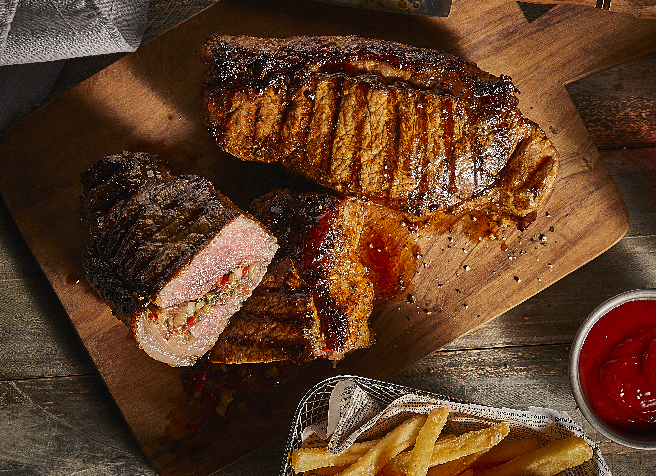 Despegar no del todo la grasa de los bifes y realizar desde ese lado un corte en la mitad formando un bolsillo sin llegar al otro lado.
