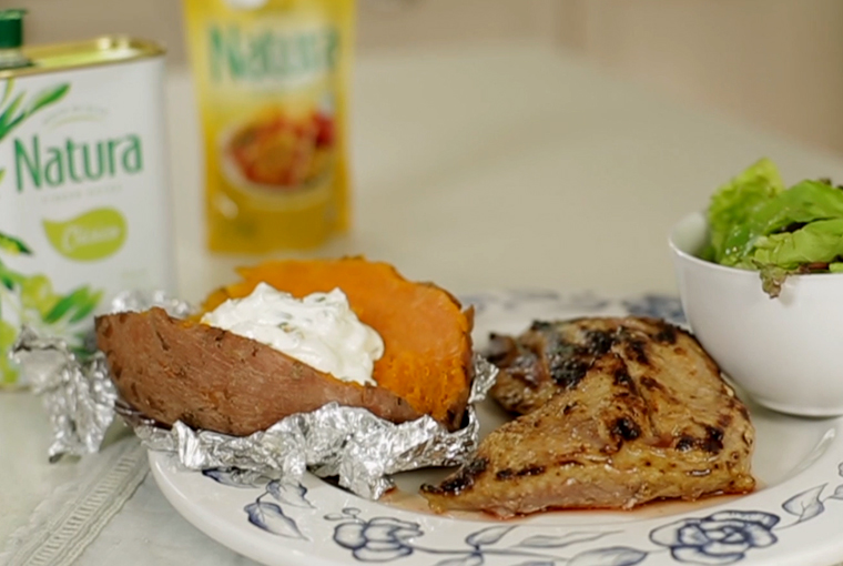 Servir los bifecitos acompañados con el boniato a la crema y la ensalada de verdes condimentada con una vinagreta obtenida de la emulsión de un hilo de Aceite Natura Clásico, el jugo de limón y la sal en escamas.