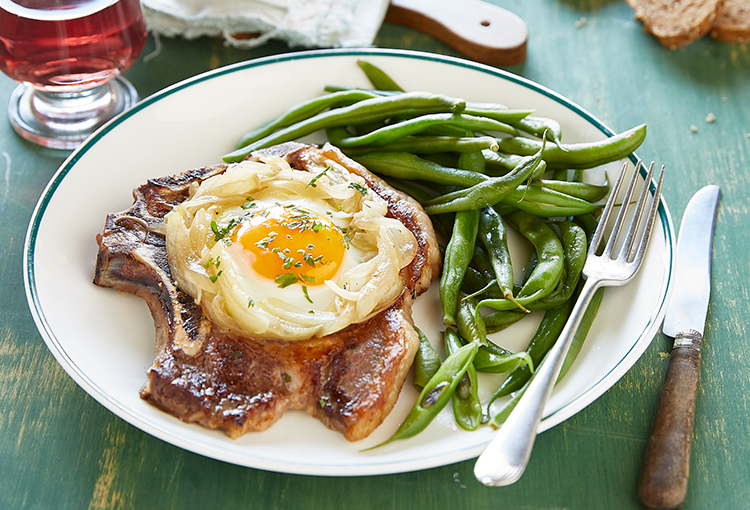 Calentar el Aceite de Oliva Selección Natura en una plancha de hierro y rehogar las cebollas cortadas en juliana con una pizca de sal. Una vez doradas retirar y reservar. En el mismo fondo de cocción, agregar otra cucharada de aceite, de ser necesario, y sellar los bifes de ambos lados sazonando a gusto. Una vez sellados distribuir sobre ellos las cebollas reservadas dejando un hueco en el centro y cascar allí los huevos, salpimentar y cubrir la plancha durante unos minutos hasta cocinar el huevo al punto deseado. Retirar, servir espolvoreados con perejil picado y acompañados de las chauchas previamente cocidas al vapor, condimentadas con el Aceite de Oliva Selección Natura, el aceto y una pizca de sal.