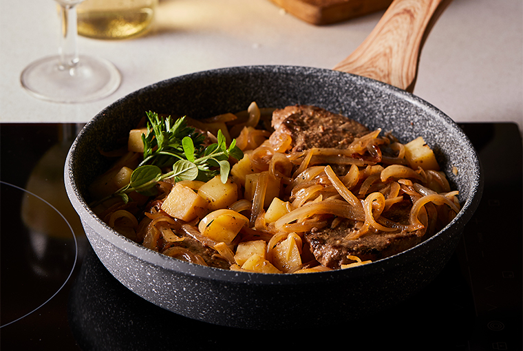 Agregar las cebollas en juliana, los cubos de papa y el vino blanco. Condimentar con sal, pimienta y orégano. Cocinar tapado a fuego bajo hasta que las verduras estén tiernas, cuidando que no se sequen, agregar agua de ser necesario.