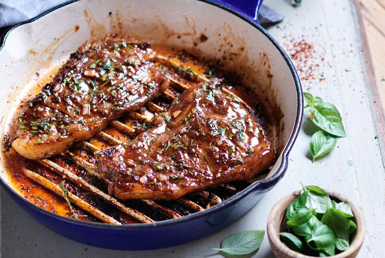 Calentar una plancha y cocinar los bifes pintándolos reiteradamente con el adobo de miel, de ambos lados, hasta que estén cocidos y glaseados. Al momento de servir untar nuevamente con el adobo.