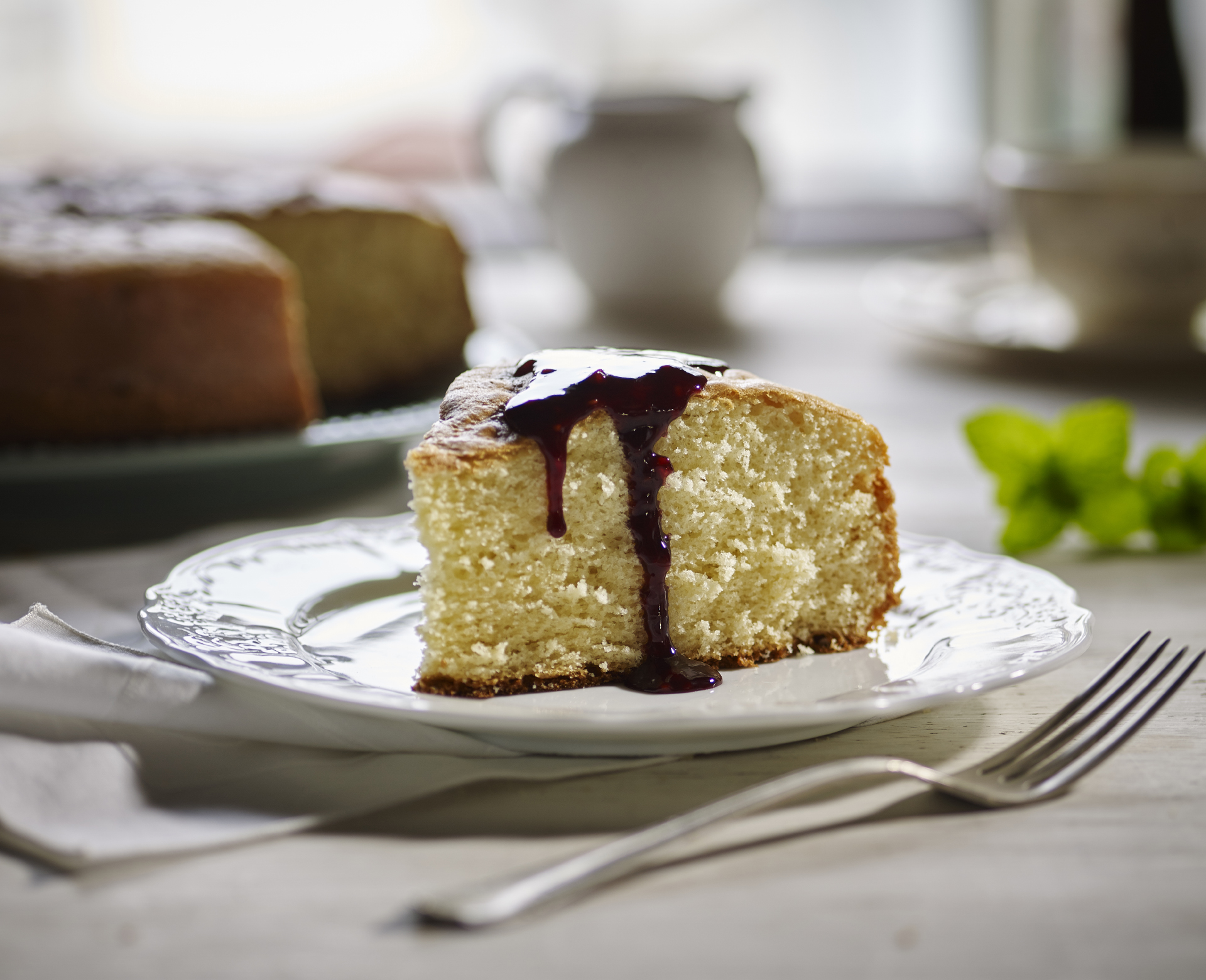 Bizcochuelo de vainilla con coulis de frutos rojos