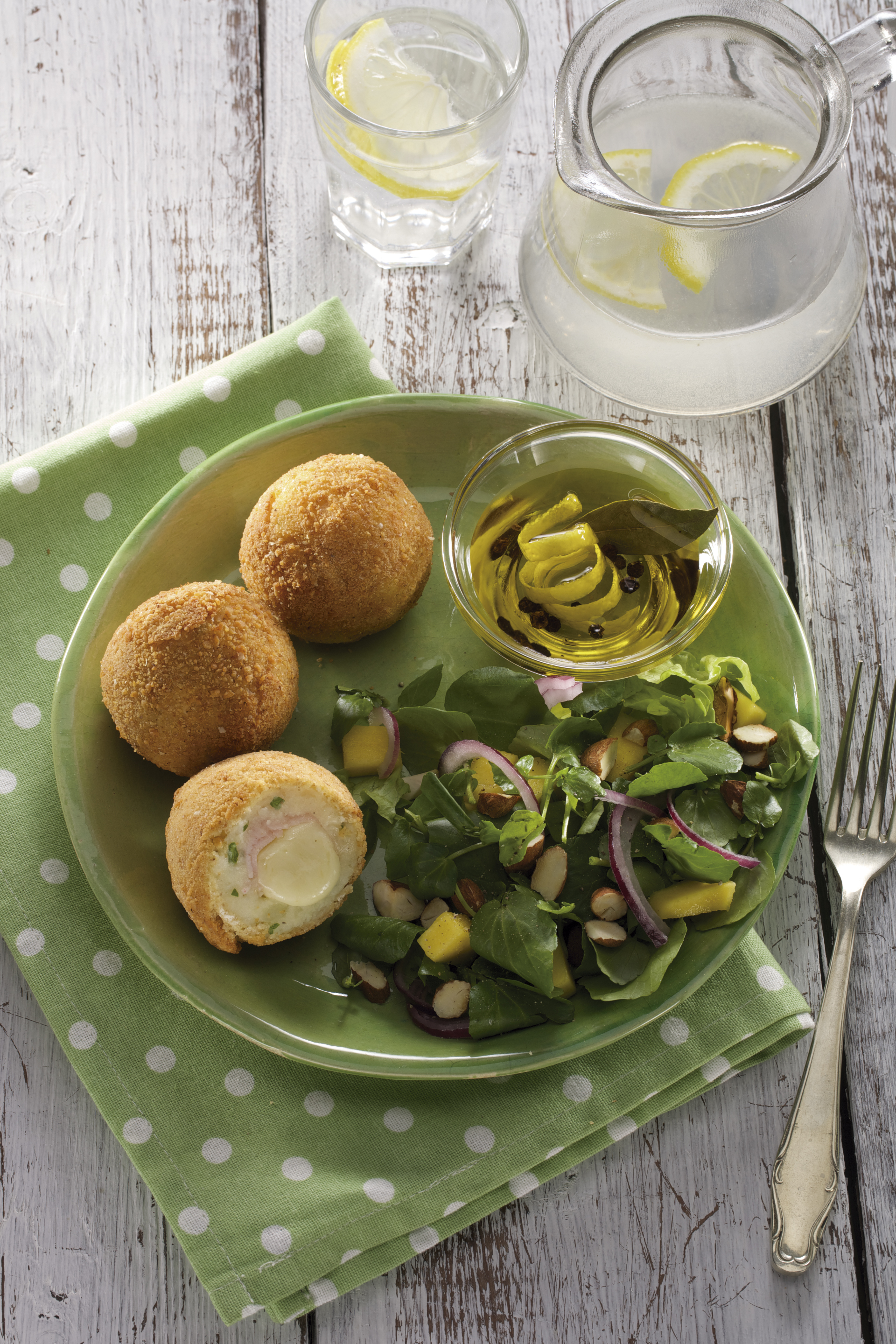 Bombas de papas con ensalada de berro, mango y almendras con aceite de oliva estacionado