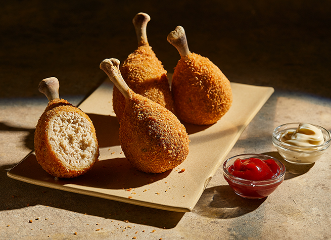 Retirar el puré de la heladera, dividirlo en 4 y formar “pelotas”. Luego, colocarlas en la palma de la mano y aplanarlas. Introducir en el centro el hueso reservado cuidando que quede una mitad por fuera, cubrir el hueso con el puré presionando bien dándole forma de “pata de pollo”.