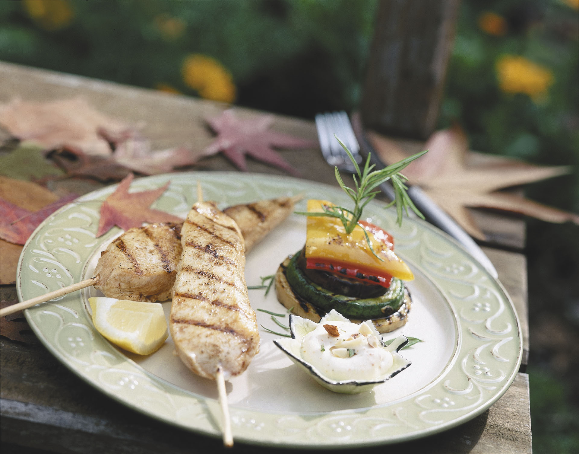 Brochetas de ave con mayonesa al limón y grillé de hortalizas
