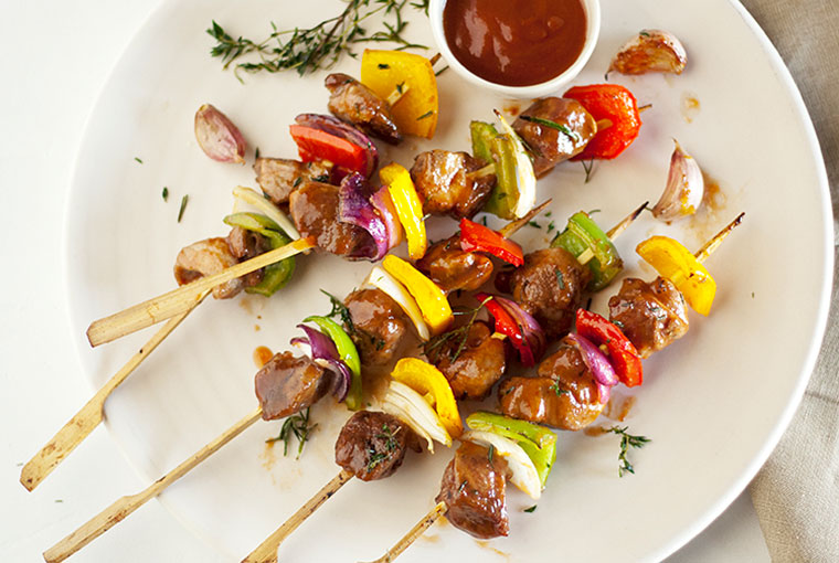 Desgrasar y cortar la bondiola en cubos. Cortar las cebollas en octavos. Quitarle las semillas y la parte blanca a los ajíes y por ultimo cortarlos en cuadrados medianos. Colocar de manera intercalada en cada palito de brochette un poco de carne con un poco de las cebollas y los ajíes. Pintar cada una con el Ketchup Natura.