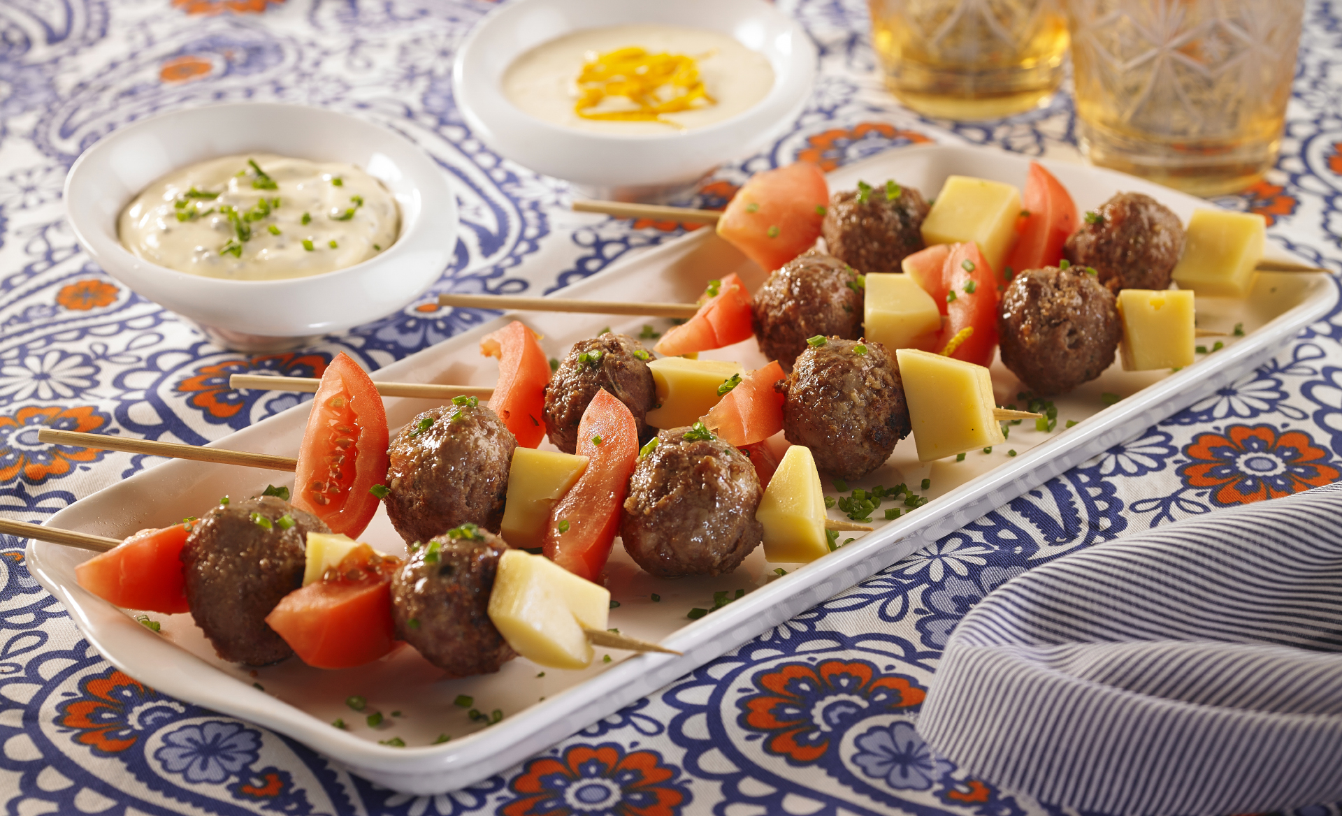 Colocar las albóndigas en una fuente para horno lubricada con Rocío Vegetal Natura. Llevar a horno hasta que estén cocidas y doradas por fuera. Retirarlas. Ensartarlas en un palito de brochette previamente lubricado con Rocío Vegetal Natura, intercalando el queso cortado en dados y los tomates. Servir con las salsas y dejarlas enfriar.