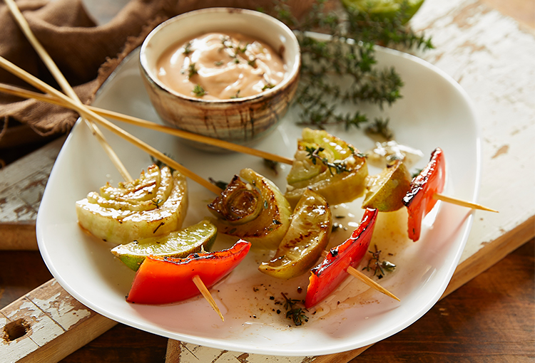 Preparar una marinada mezclando el jugo de lima, el Aceite de Oliva Clásico Natura, los ajos, el tomillo, una pizca de sal y pimienta. Embeber los vegetales, dejándolos marinar durante una hora.