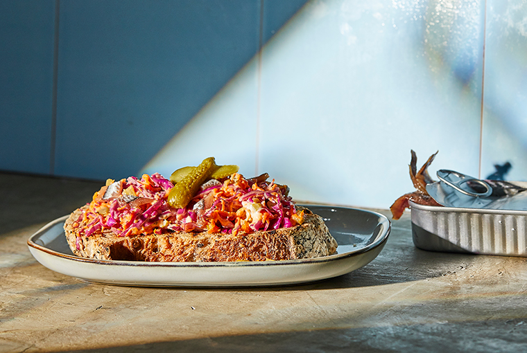 Para el armado, distribuir sobre las bases de pan tostado una porción generosa de la ensalada de col lombarda y disponer por encima los filetes de anchoas picados.