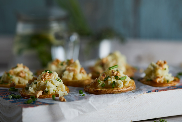 Cubrir generosamente las bases de papa con la mezcla de queso azul, disponerlas sobre la fuente o plato a servir, decorar con unos tallos de ciboulette.