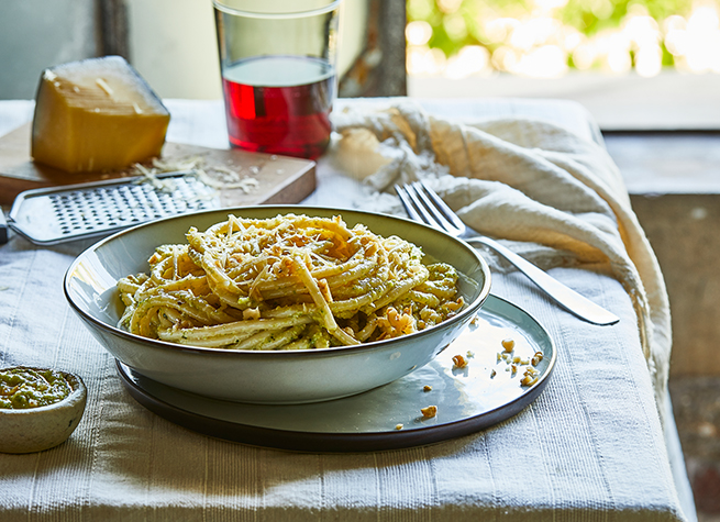 Cocinar los bucatinis en abundante agua salada. Retirarlos a punto, colar y servir en platos individuales con una cucharada de pesto de zucchinis por encima. Decorar con hoja de albahaca fresca y nueces picadas groseramente.