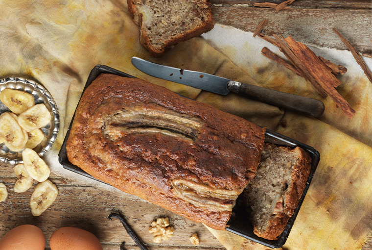 Colocar la preparación en la budinera, decorar con las nueces enteras, agregar la banana al medio y llevar a horno precalentado durante unos 40-45 minutos aproximadamente hasta lograr la cocción. Retirar, dejar entibiar, desmoldar, dejar enfriar y servir.
