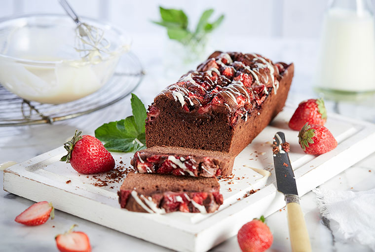 Volcar la mezcla en una budinera lubricada con Rocío Vegetal Natura y espolvoreada con harina. Distribuir las frutillas en la mezcla y llevar a horno medio precalentado durante unos 40 minutos aproximadamente hasta que al introducir un palillo éste salga seco.