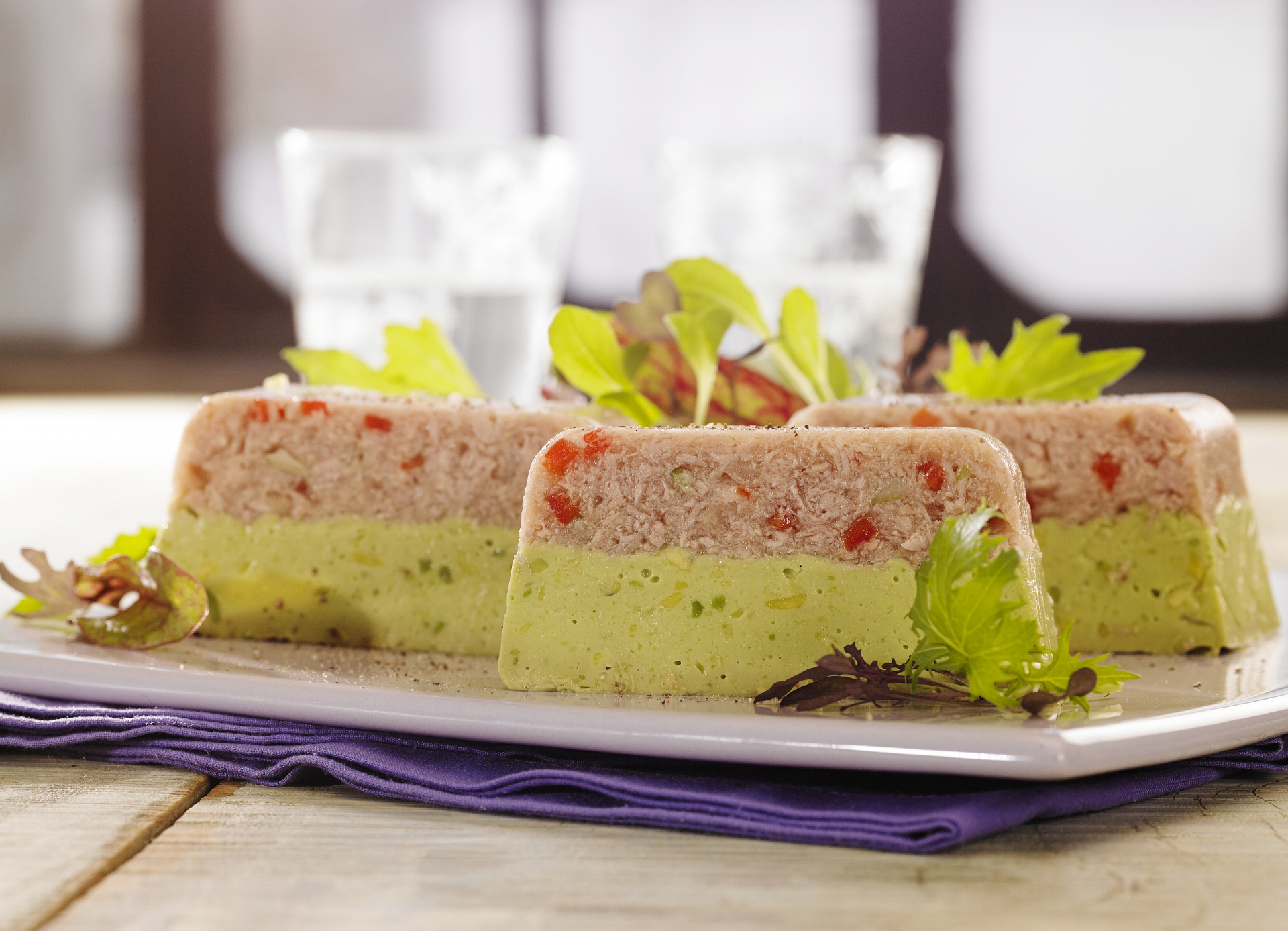 Para realizar la base, hidratar primero la gelatina con el agua fría, luego añadirla al caldo de verduras caliente. Reservar en la heladera hasta que tome una consistencia espesa (tipo clara de huevo). Retirar de la heladera e incorporarle el atún escurrido, el apio y los ajíes.