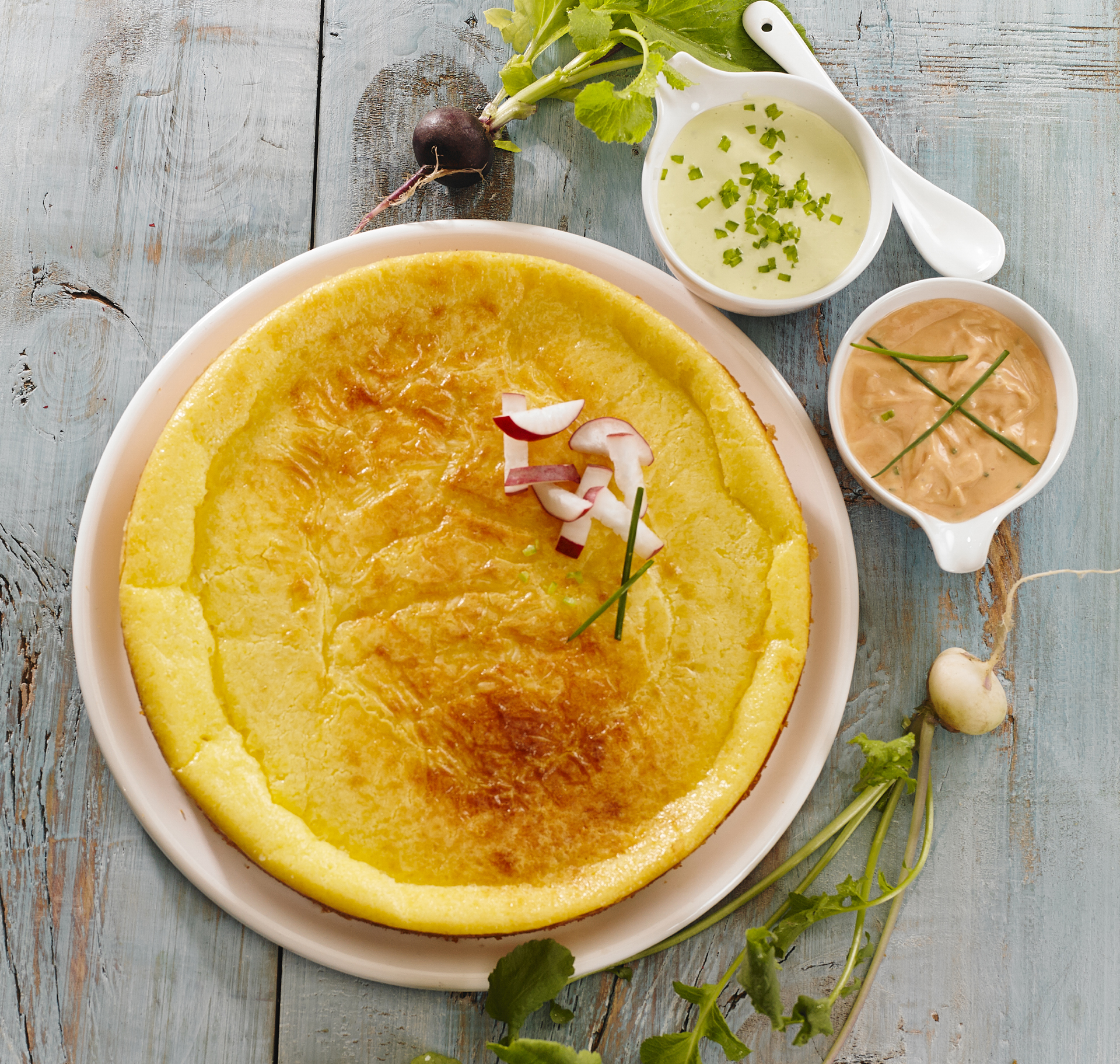Armar el dip mezclando el queso crema, la Mostaza Natura y la cebolla de verdeo picada. Servir acompañando al budín de queso.
