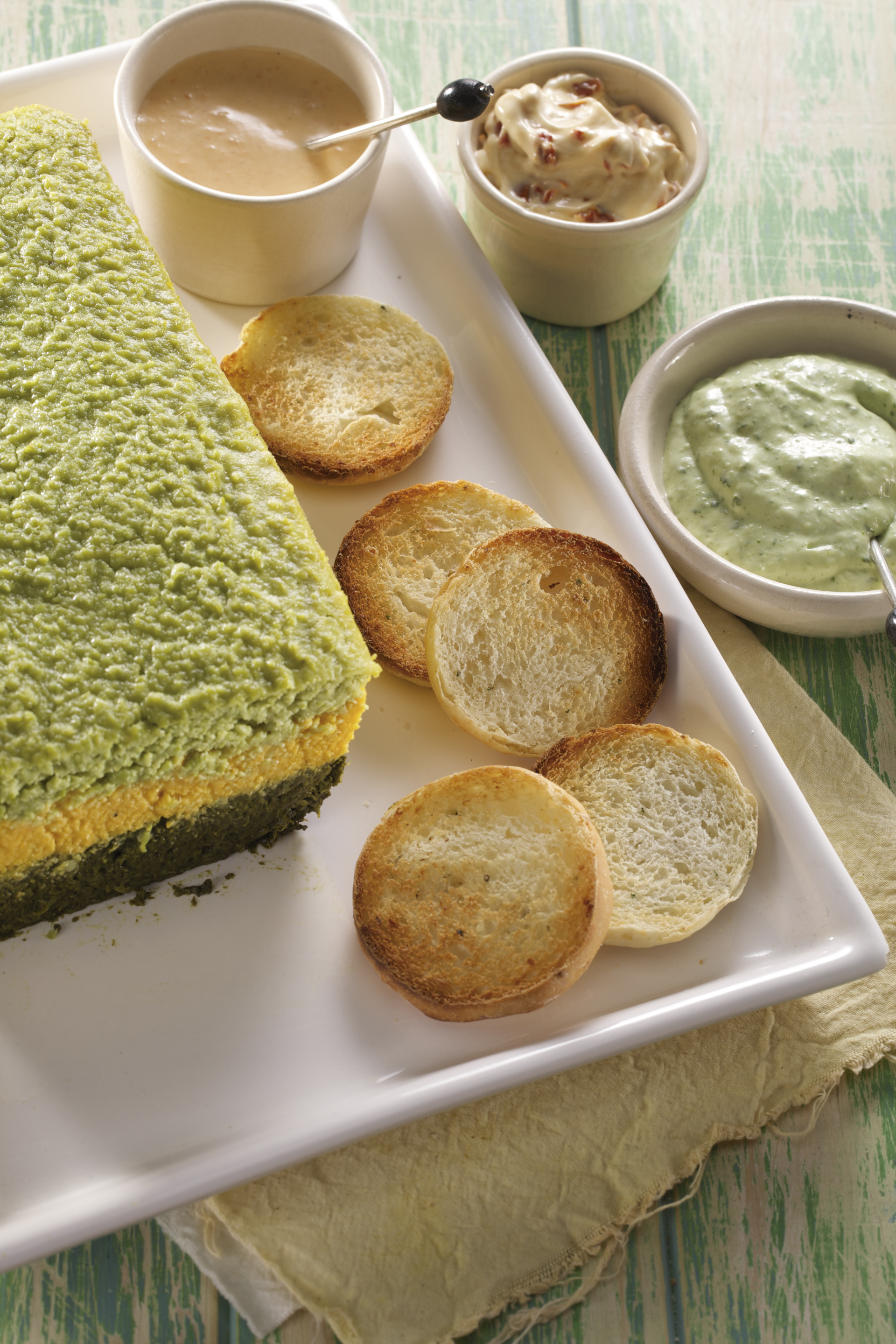 Budín de verduras tricolor con figacitas tibias y dips