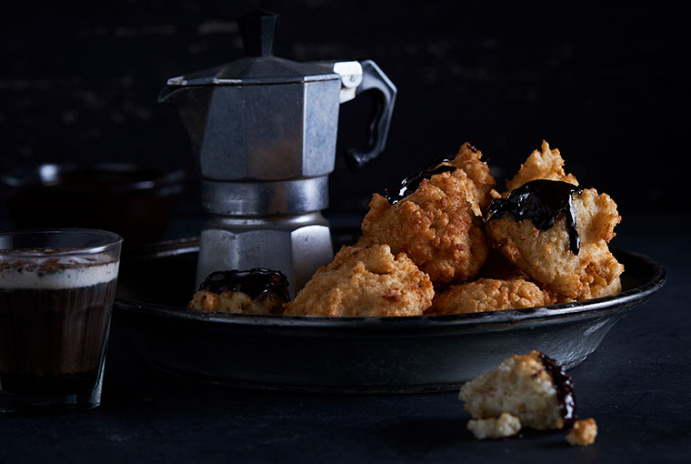 Servir los buñuelos tibios bañados con hilos de chocolate amargo sin TACC fundido a Baño María o en microondas.
