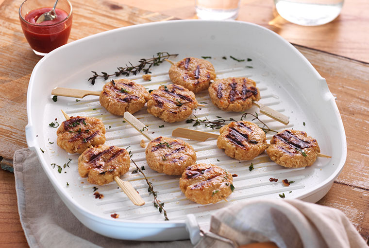 Cortar el pan en cubos y remojarlos con la leche. Agregar el ajo, los condimentos, el queso rallado e integrar bien la mezcla. Formar pequeñas hamburguesas, pincharlas de a dos en palillos de brochette y pincelar de ambos lados con el Aceite de Oliva Selección Natura.