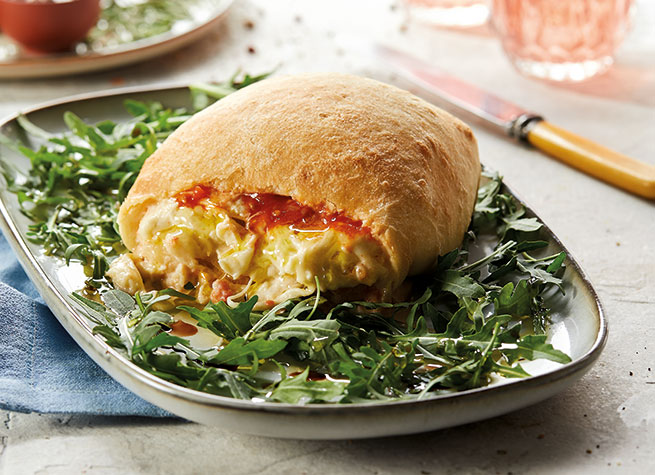 Lubricar el centro de una pizzera con abundante Rocío Vegetal Oliva Natura, colocar la masa y verter en el centro una cucharada de la salsa pomodoro. Disponer sobre ésta la burrata bien escurrida, subir los bordes y juntarlos arriba cubriendo completamente el queso con la masa. Presionar bien para cerrar. Llevar al horno hasta que la superficie esté dorada.