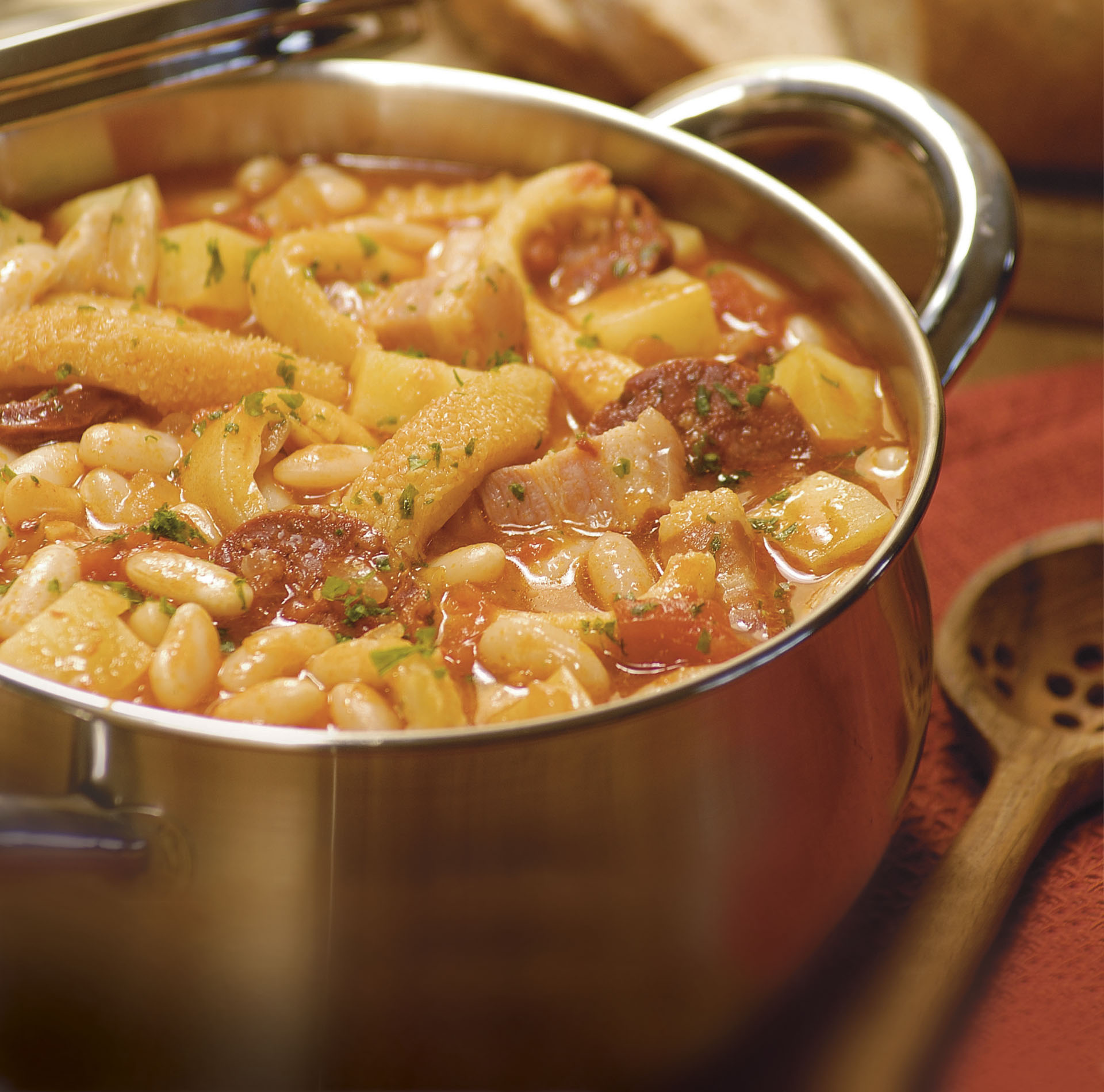 Calentar una olla, verter el Aceite Puro de Girasol Natura, rehogar las cebollas picadas y una vez que estén transparentes agregar el chorizo colorado en rodajas, el ajo y el perejil, dorar 1 minuto más e incorporar las tiras de mondongo, el tomate, los porotos previamente hervidos en abundante agua con sal, las papas, la panceta, el caldo y condimentos.