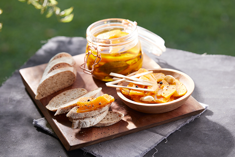 Retirar el paño y comenzar a acomodar las fetas de calabaza en un frasco de boca ancha intercalando láminas de ajo, orégano, pimienta y el Aceite de Oliva Selección Natura.