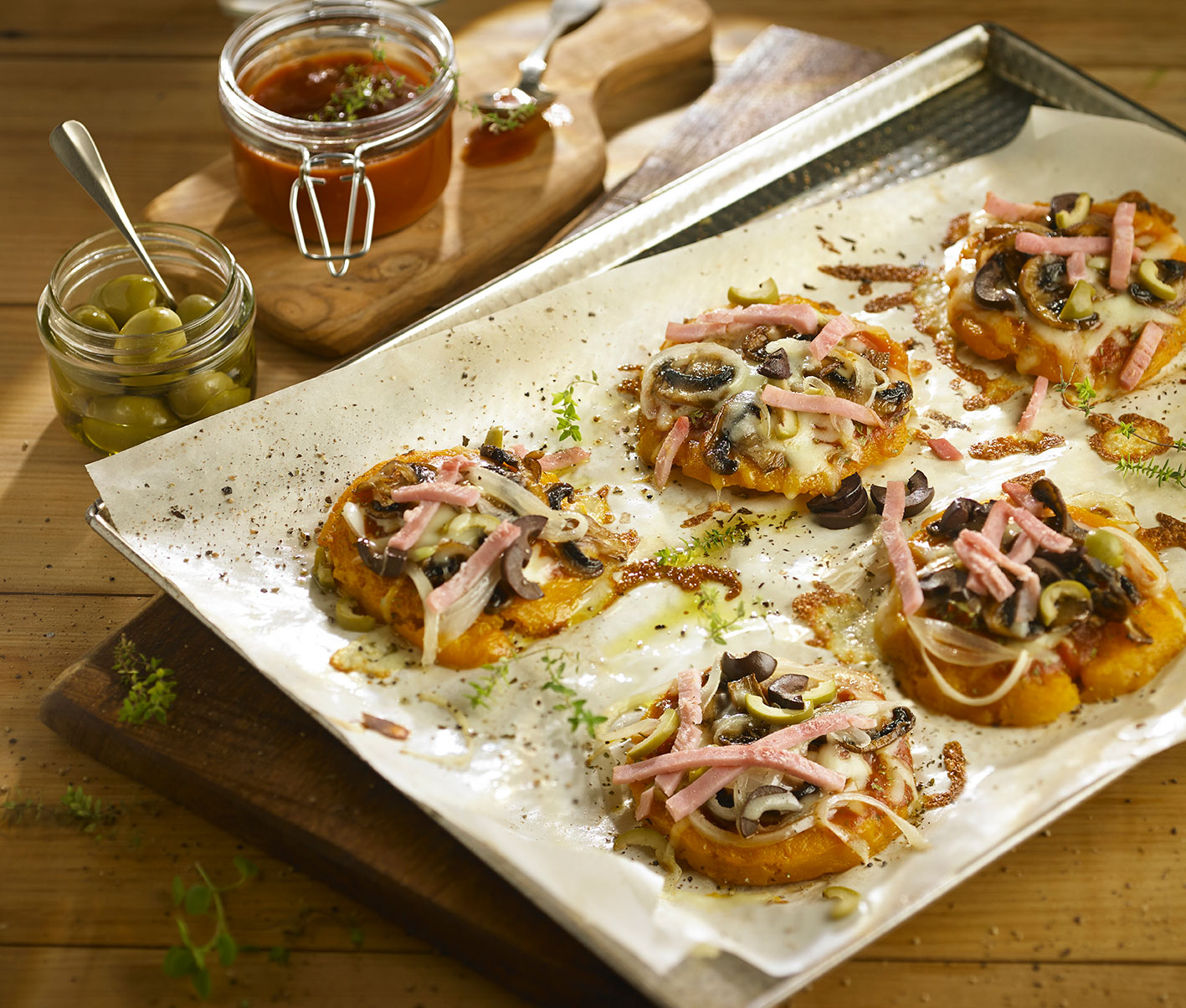Retirar la calabaza del horno con cuidado y extender una cucharada del puré de tomates previamente sazonado con sal, pimienta y una pizca de orégano sobre cada rodaja. Agregar por encima la cebolla rehogada, los champiñones, el jamón cocido, las aceitunas negras y la mozzarella rallada. Hornear por otros 4-5 minutos o hasta que se funda el queso.