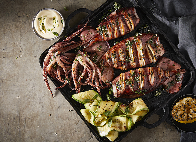 Pasado el tiempo de maceración de los calamares, cocinar sobre una plancha o chapa durante 3-4 minutos por lado junto con el fondo del macerado.