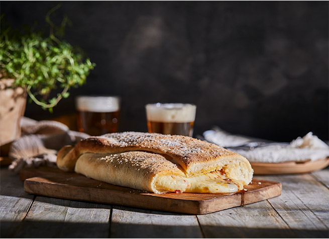 Desgasificar la masa colocándola sobre una superficie enharinada y presionarla con los dedos del centro hacia los extremos para retirar todo el aire del leudado. Luego estirar formando un rectángulo grande. Colocar el relleno sobre una de las mitades del rectángulo. Doblar por encima el resto de la masa y cerrar el calzone con un repulgue. Untarlo con Aceite de Oliva Intenso Natura, y espolvorear con sal entrefina y ají molido.