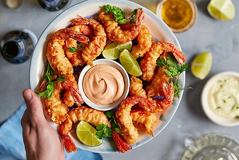 Calentar una sartén con abundante Aceite Puro de Girasol Natura. Tomar los camarones por las colas, hundirlos en la mezcla, y freír hasta dorar.