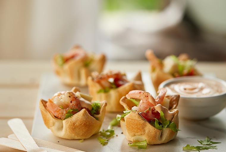 Para el armado de las canastitas, acomodar sobre la base un puñado de lechuga y sobre éstas los palmitos, los tomates y los camarones. Por último condimentar con una cucharada del aderezo reservado.