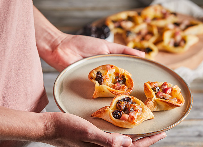 Cortar la panceta en cubos pequeños, disponerlos en un bowl. Agregar la mozzarella rallada y las ciruelas picadas, ajustar con pimienta negra molida e integrar bien. Reservar.