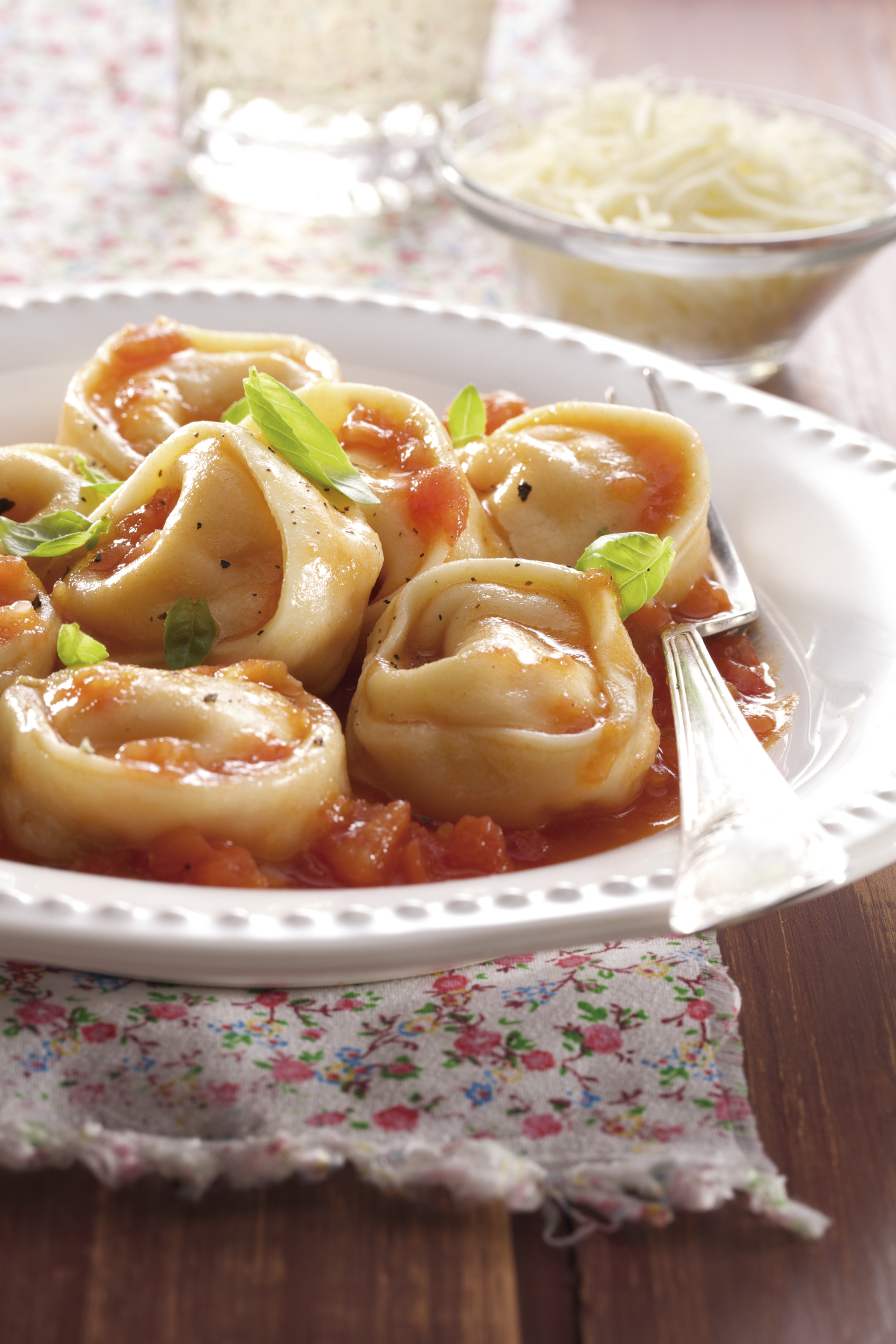 Capelettis rellenos de calabaza con salsa de tomates frescos y oliva