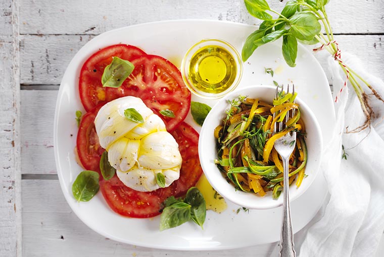 Dejar cocinar unos pocos minutos más teniendo la precaución de mezclar bien los ingredientes. En el entretiempo cortar los tomates en fetas finas así como también la mozzarella. Disponer en el plato a servir las fetas de mozzarella y tomate en modo alternado y en el centro disponer las verduras salteadas al tomillo. Rociar cada plato con 1 cda. de Aceite de Oliva Selección Natura. Decorar con hojas de albahaca y orégano.