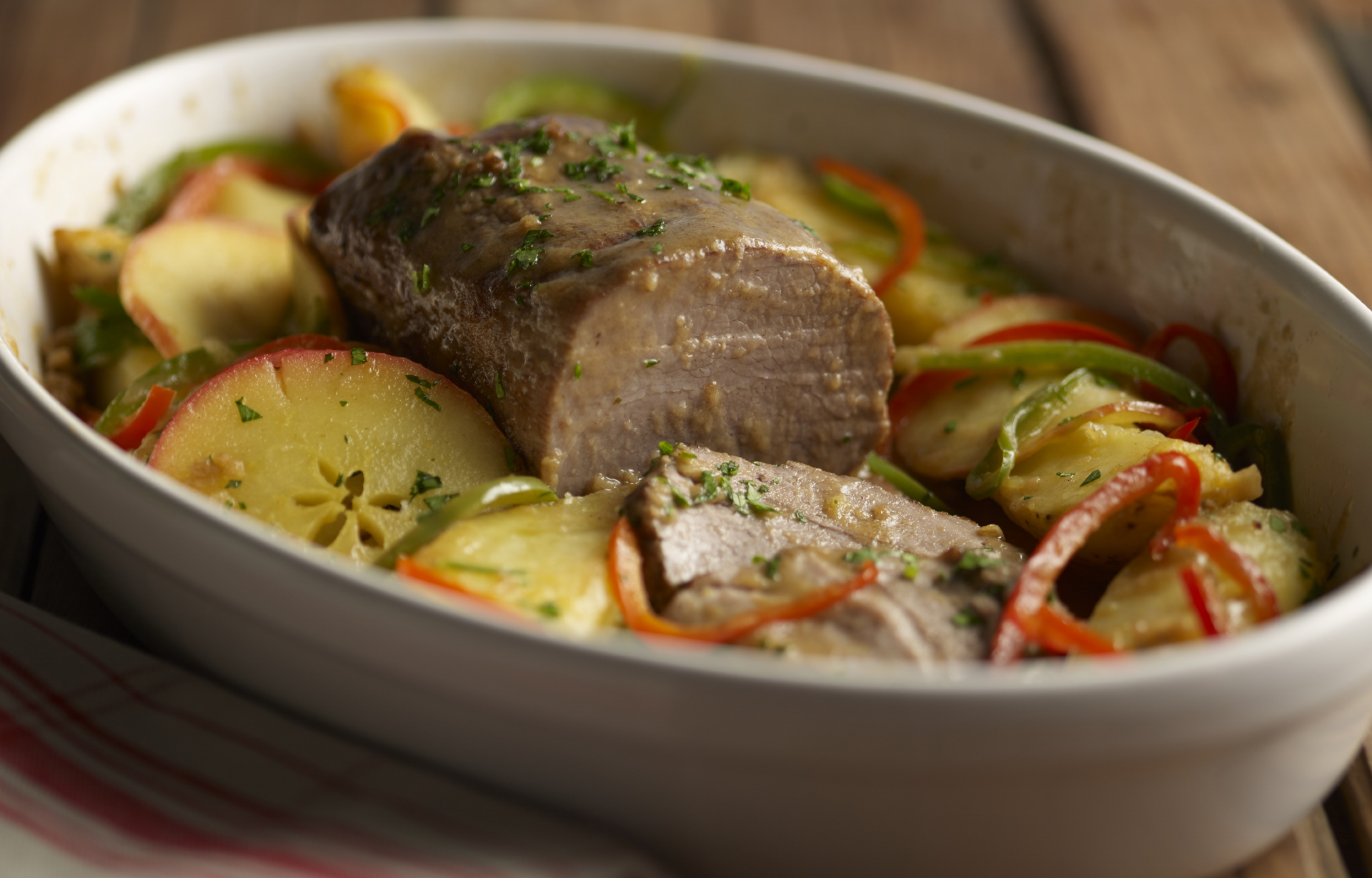 Untar la carne con la Mostaza Natura, y espolvorearla con la mitad del polvo de la sopa crema de cebollas(*). Colocar el peceto en una asadera para horno, rociarla con el Aceite Natura Blend, el vino blanco y el caldo de carne. Salpimentar a gusto, tapar la asadera con papel aluminio y llevar a horno moderado durante 30 a 40 minutos. En la mitad de la cocción agregar los ajíes y la manzana.