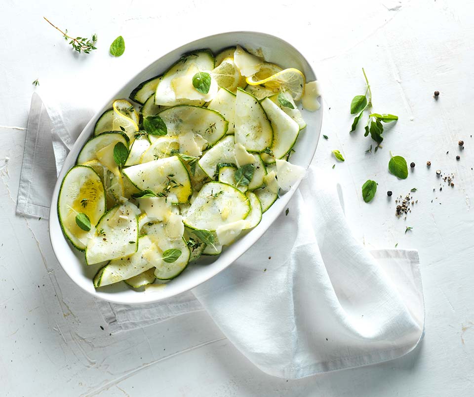 Lavar bien y despuntar los zucchinis, secarlos con la ayuda de un papel absorbente y cortarlos por lo largo en fetas muy finas con una mandolina o pela papas.
