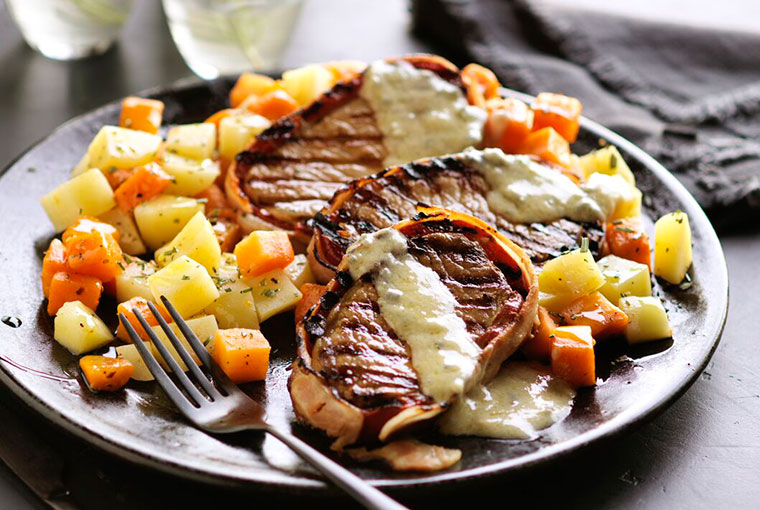 Carré de cerdo al roquefort con papas y zanahorias noisette