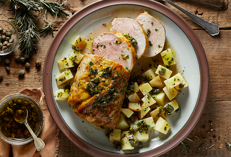 Cortar el carré de cerdo en finas fetas, servirlo acompañado de las papas en cubos y la gremolata de alcaparras.