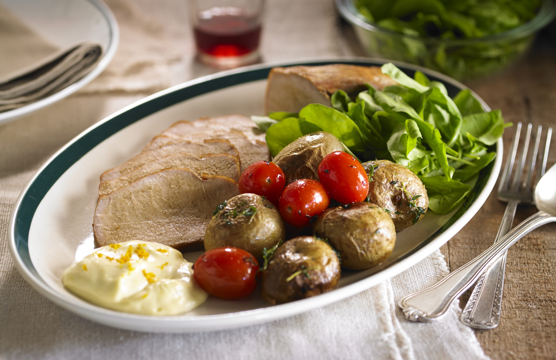 Para la presentación, cortar el carré de cerdo en finas fetas, servir acompañado de la mayonesa cítrica y de una guarnición de rúcula, tomates cherry y papines hervidos.