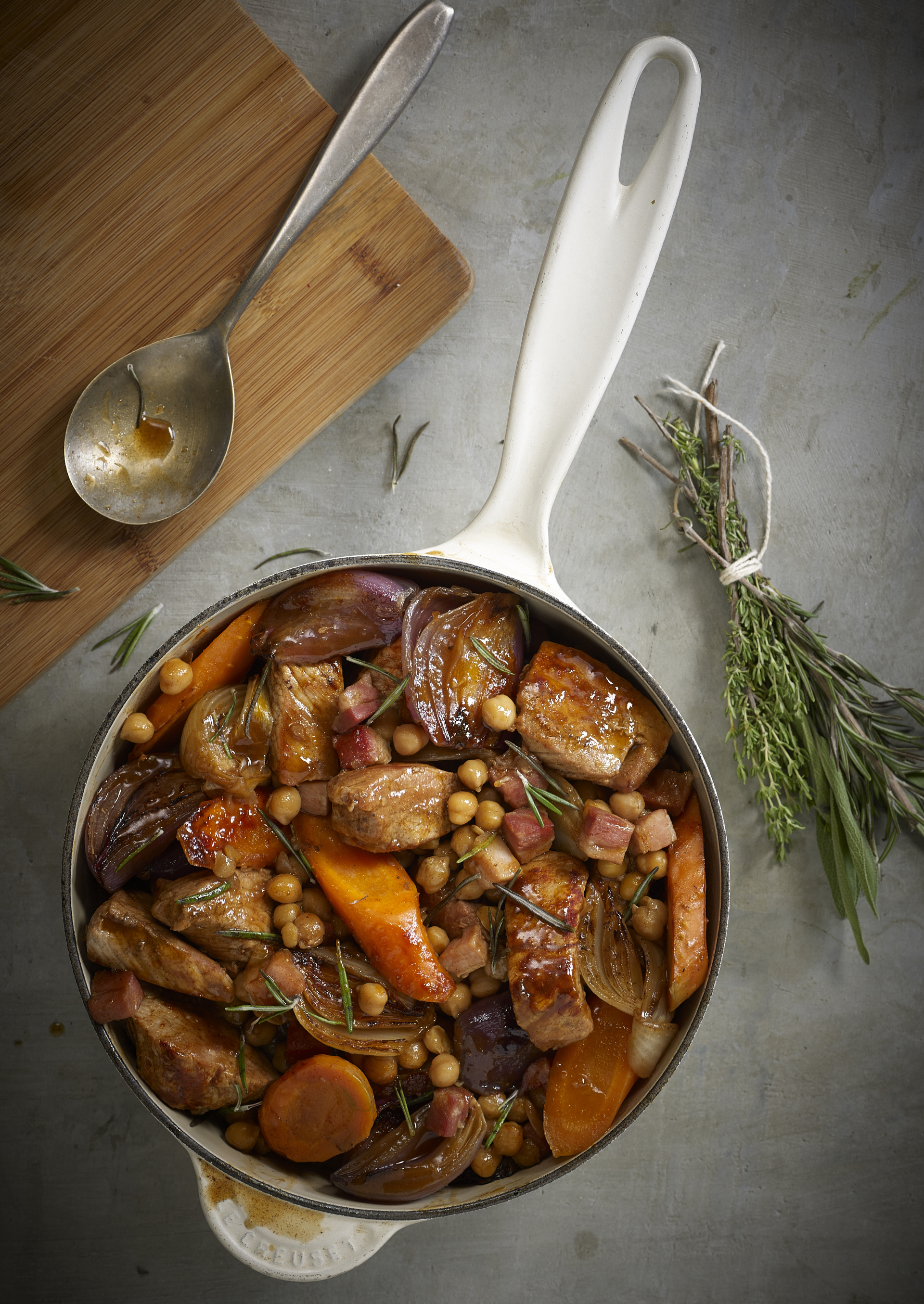 En una cacerola aparte cocinar los cubos del lomo de cerdo junto con el Aceite Natura Blend, una vez que la carne haya sellado, añadir las cebollas cortadas en cuartos y las zanahorias en trozos. Dejar cocinar unos minutos hasta que los vegetales comiencen a tiernizar. Añadir los garbanzos escurridos junto con la panceta. Condimentar con sal, pimienta paprika a gusto y el romero. Verter el caldo de carne y dejar cocinar hasta reducir.
